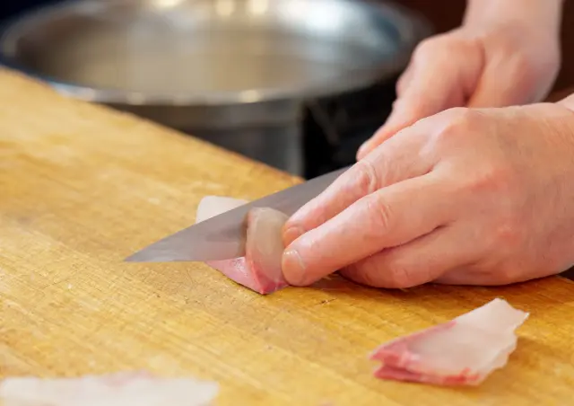 月のように柔らかな光を宿した刃。魚をおろすたびに、職人の技を感じさせます。 A blade that glows like the hazy moon — ideal for precise fish preparation.